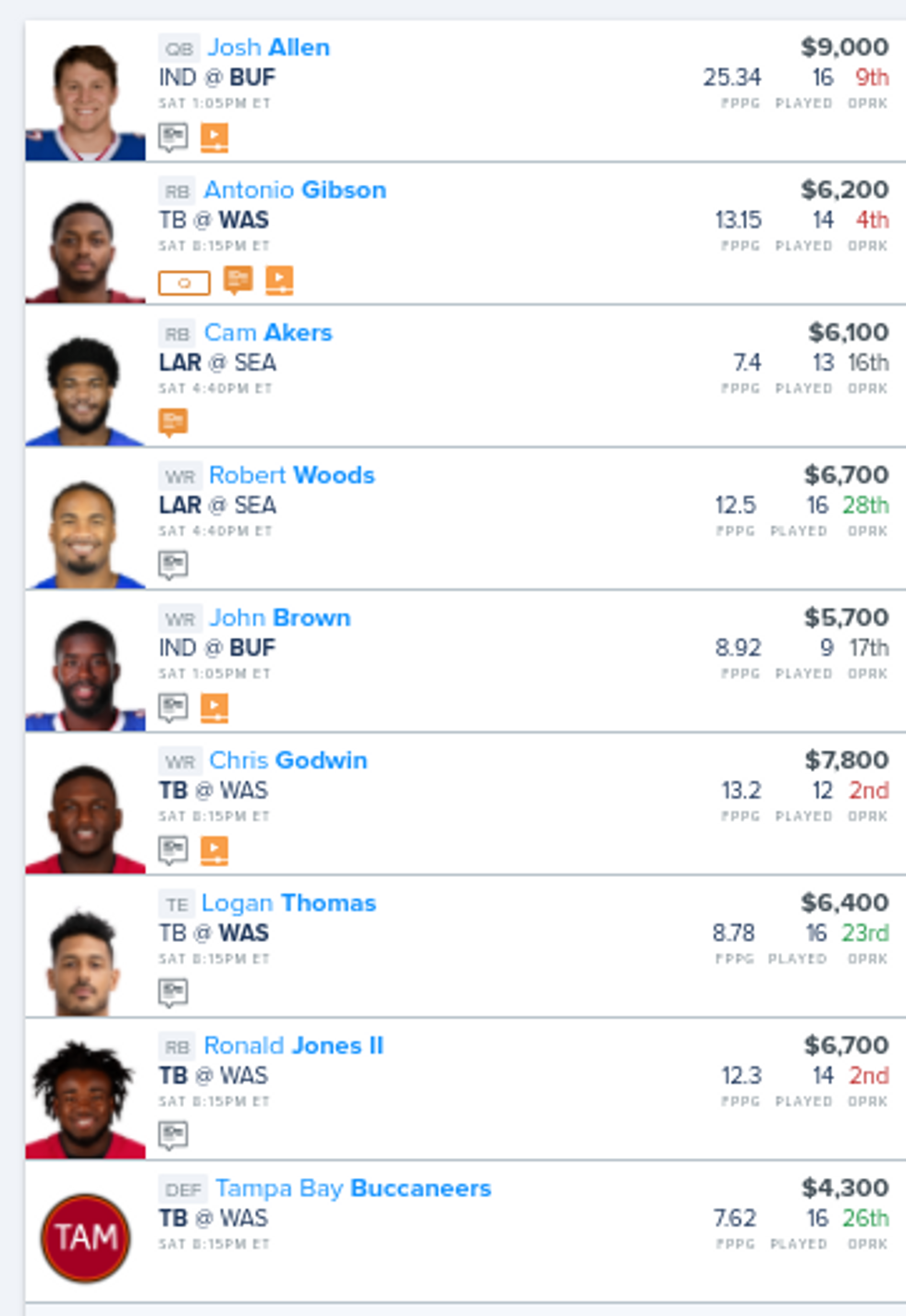 Woods may same like a peculiar start after what we just talked about with Akers, but he can still be a safety valve for whoever is playing QB for the Rams, and with a lessened field because of playoffs, you have to get creative with lineups.
