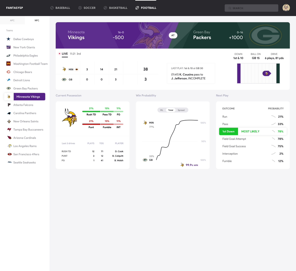 FantasySP utilizes Predictive Analytics that provide sports fans and gamblers with their own analytics platform. So, you can predict the outcome of a game, play, or possession in real time and take back some control from oddsmakers.