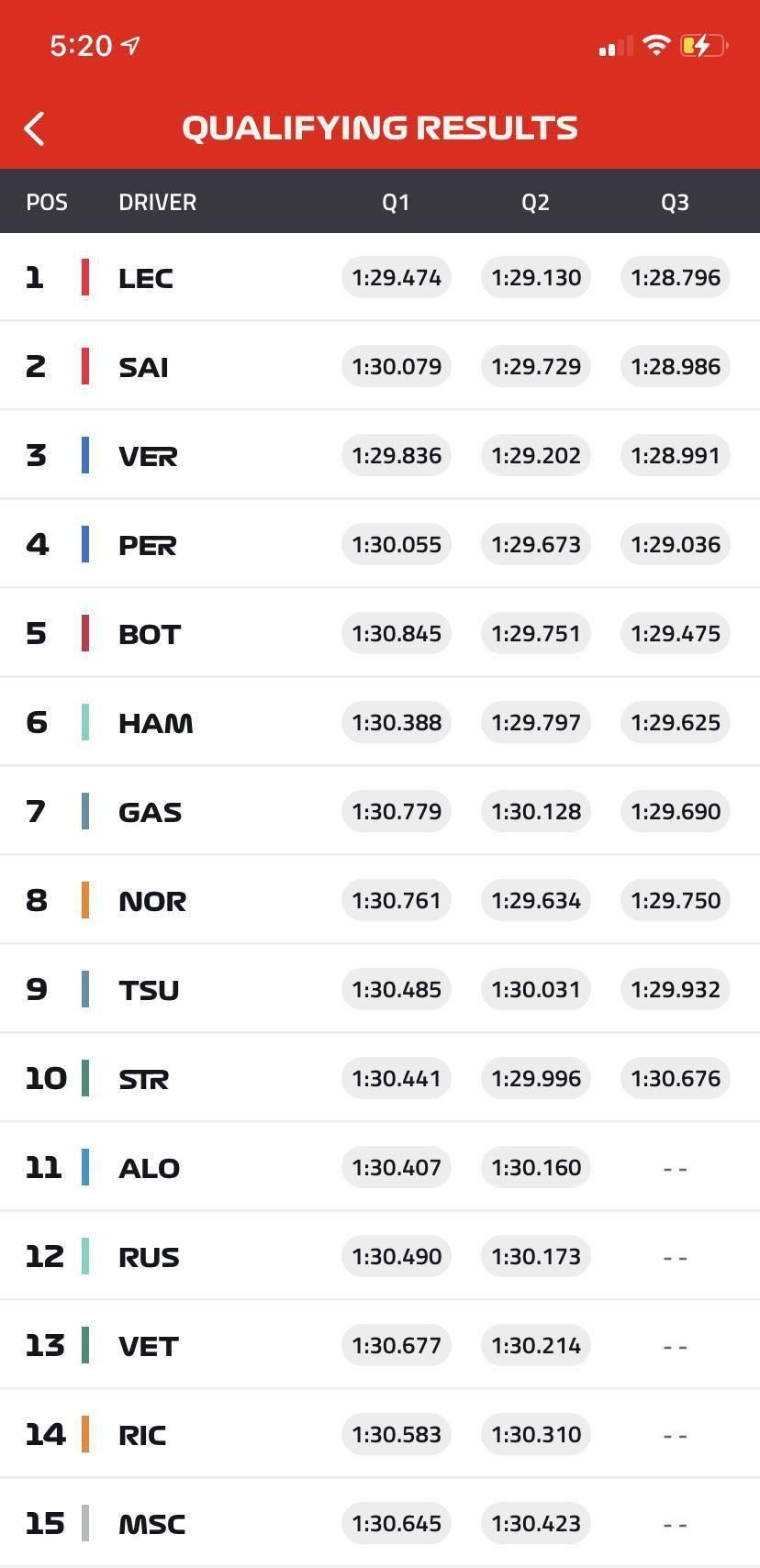 * Note: Starting Grid and Qualifying Results are identical. For example: Charles Leclerc will start in first place for Ferrari, Lando Norris will start in eighth place, and Sebastian Vettel will start in 13th place. The positioning in the starting grid is a direct reflection of the fastest laps achieved during Qualifying*