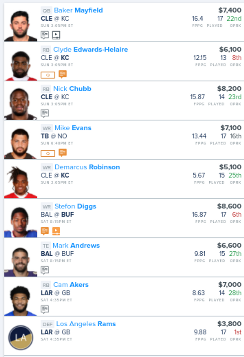 Wondering if Clyde Edwards-Helaire could get more run than we've seen yet vs. the Browns -15, 12, 21 and 15 touche… https://t.co/hAp3DlievP— Ian Hartitz (@Ian Hartitz) 1610648344.0Nick Chubb (RB) - $8200
