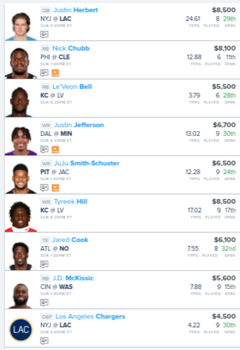 Herbert gets the lowly Jets this week and he’s shown he can hang points against better defenses earlier in the season. He’s an under the radar DFS play this week.