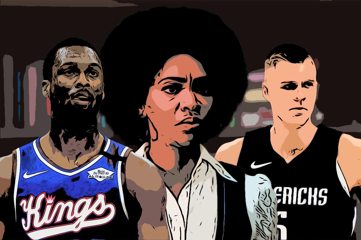 From left to right: Harrison Barnes, Monica Rambeau (Teyonah Parris), Kristaps Porzingis